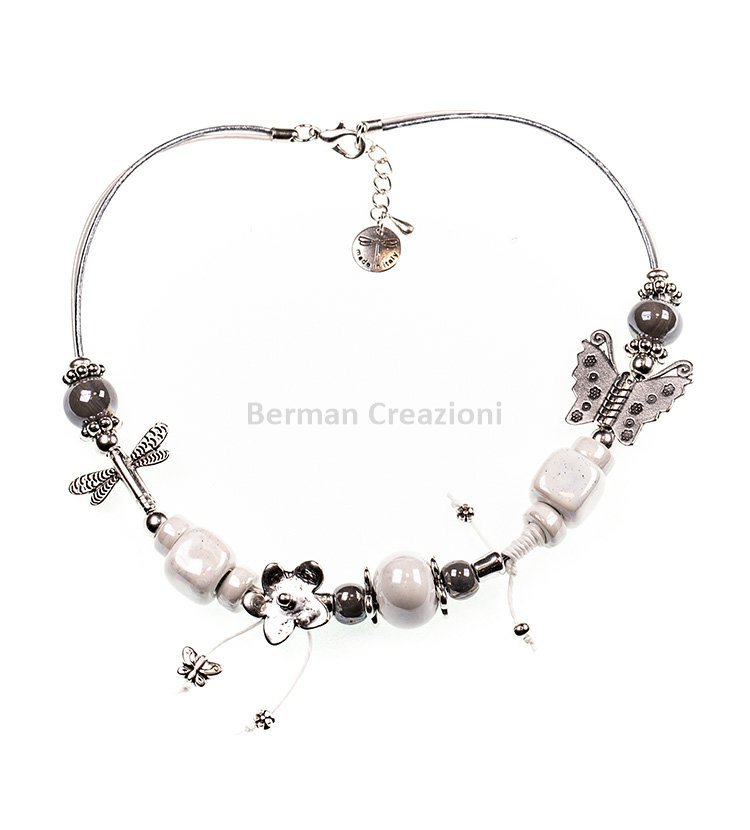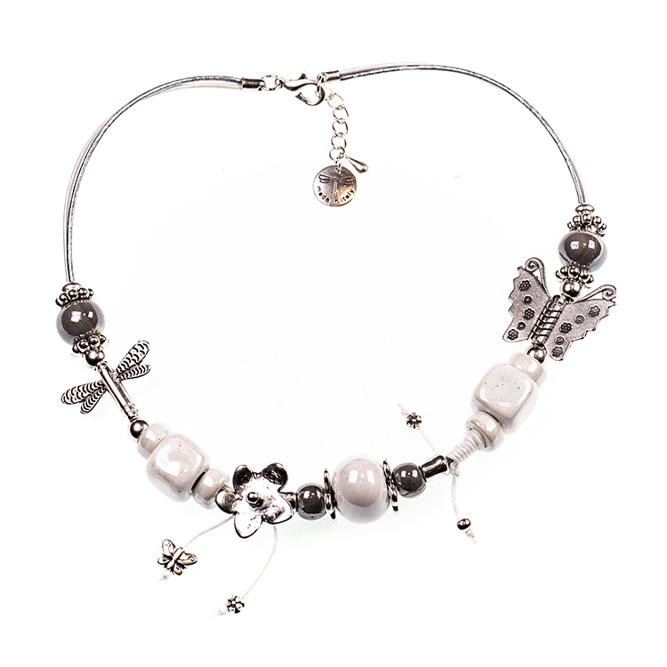 Kůže propletená s malovanou a glazovanou keramikou s chromatickými efekty a komponenty v zamaku. Délka 43 cm, nastavitelné zapínání na řetízek.